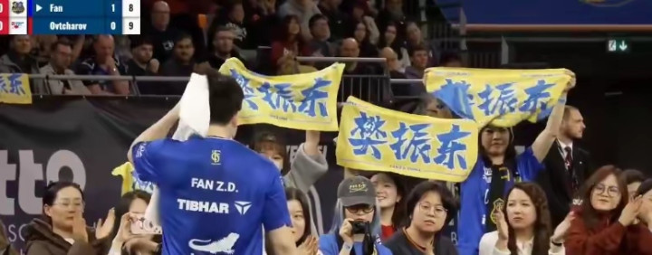 学喊“樊振东加油”的中文声浪,此起彼伏