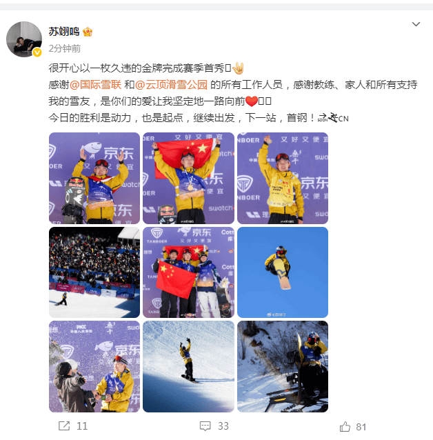 夺冠后,苏翊鸣更新社媒晒现场照,配文写道:很开心以一枚久违的金牌完成赛季首秀
